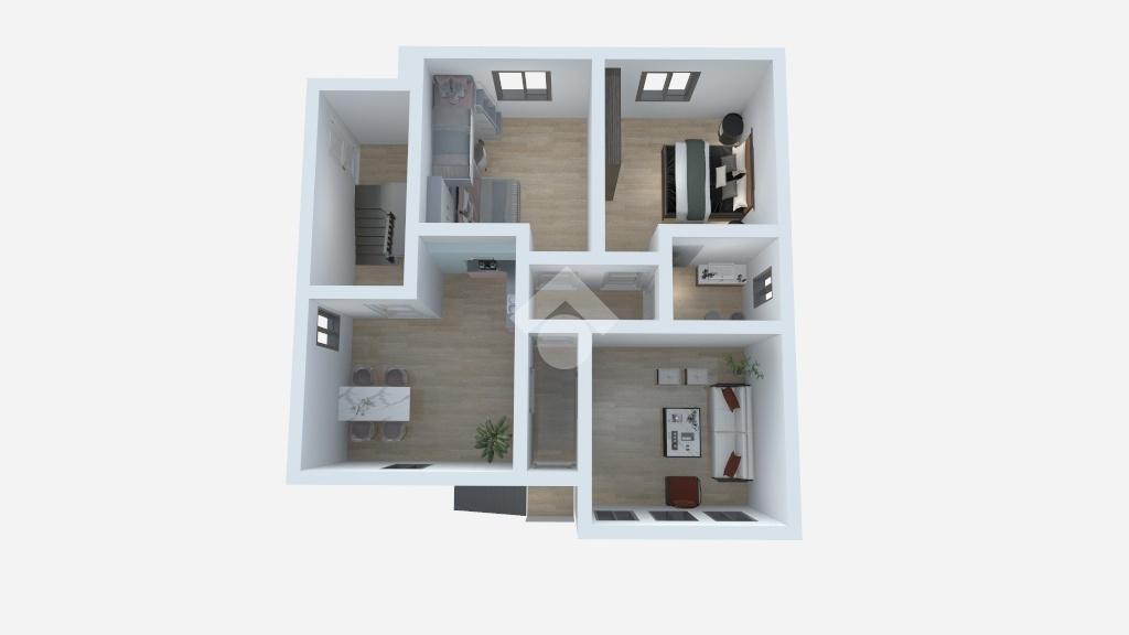 Al piano primo si sviluppa il secondo appartamento, rinnovato negli anni con numerosi lavori tra cui la sostituzione degli infissi, la caldaia, la pavimentazione, l'installazione dell'impianto di area condizionata ed è è così distribuito: soggiorno con cucina a vista, due locali e servizio oltre terrazzo e balcone.